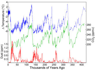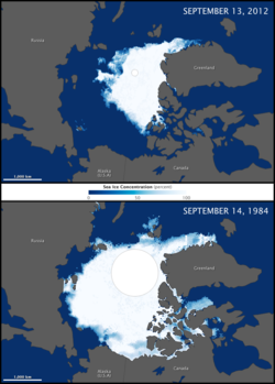 南極ボストーク湖の氷床コアに記録された過去40万年間の気温、二酸化炭素濃度、ダスト量の変化。 スクリップス海洋研究所が測定し公表している「キーリング曲線」と呼ばれる地球大気の長期間にわたる二酸化炭素濃度測定グラフ 北極の海氷は毎年冬にかけて成長し、夏にかけて溶け、通常9月頃に最小になる。上記のマップは、北極圏の氷が(上)2012年と(下)1984年に最小になった時のサイズを比較したものである。北極圏の海氷の減少(英語版)